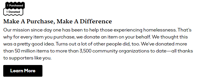 Bombas’s copywriting does a great job of speaking to their audience. When talking about their mission, they incorporate their audience into the text. They talk about how donating an item on the customers’ behalf was a good idea and how it “turns out a lot of other people did, too.”