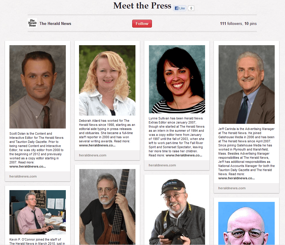 The Herald News created a “Meet the Press” board with headshots and a short bio of each member of their staff. This is a great idea for companies who talk to their customers primarily through email or over the phone because customers are able to match a face with the name.