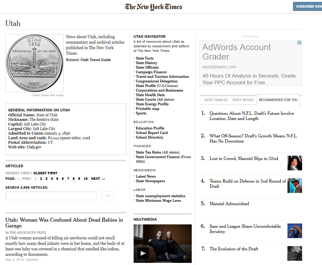 While this is smart structurally, you end up with random, mostly empty topic pages about things like “fluorescent”. The New York Times is using a more tactical strategy. Instead of only having auto-generated pages, they have unique content on thousands of topic pages. Some of these are geo-targeted to states or cities.