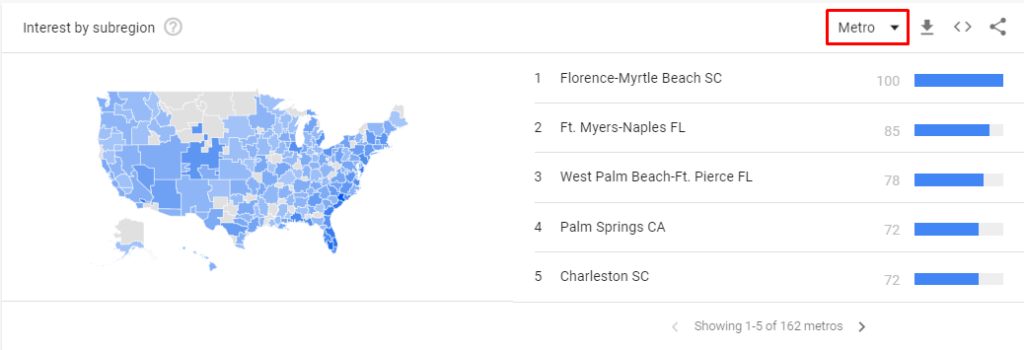 The map on Google Search Trends Explore isn’t just country-specific — it also breaks down interest in subregions, metros, and cities. This means you can see how marketable your services are in your target cities and states. Location trends can affect your local SEO efforts.