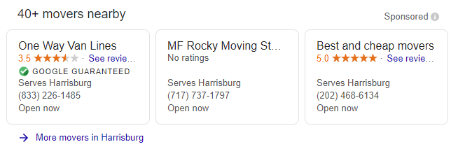 These ads appear at the top of local search results, and they operate similarly to PPC ads. Again, these paid ads aren’t part of the organic search results, but they do appear in local searches. They look like this: