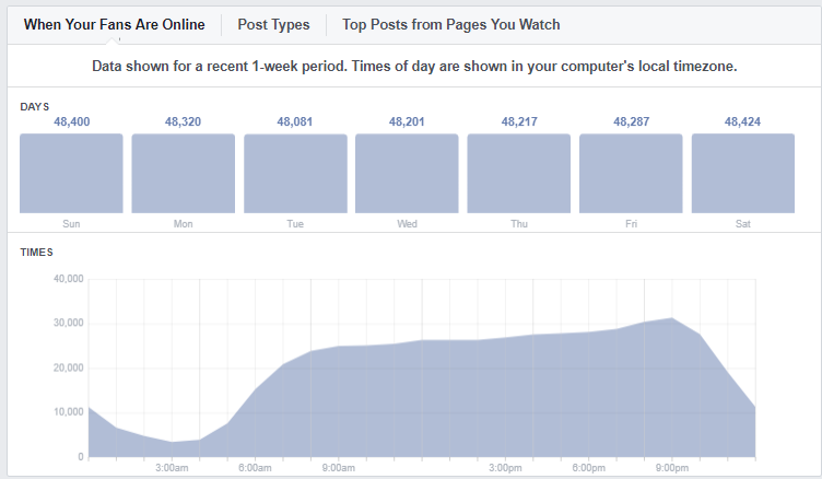 Your fans Find out when your fans are online. Go to your Page Insights and navigate to Posts. You’ll see data for a recent 1-week period on the days and times that your fans are online.