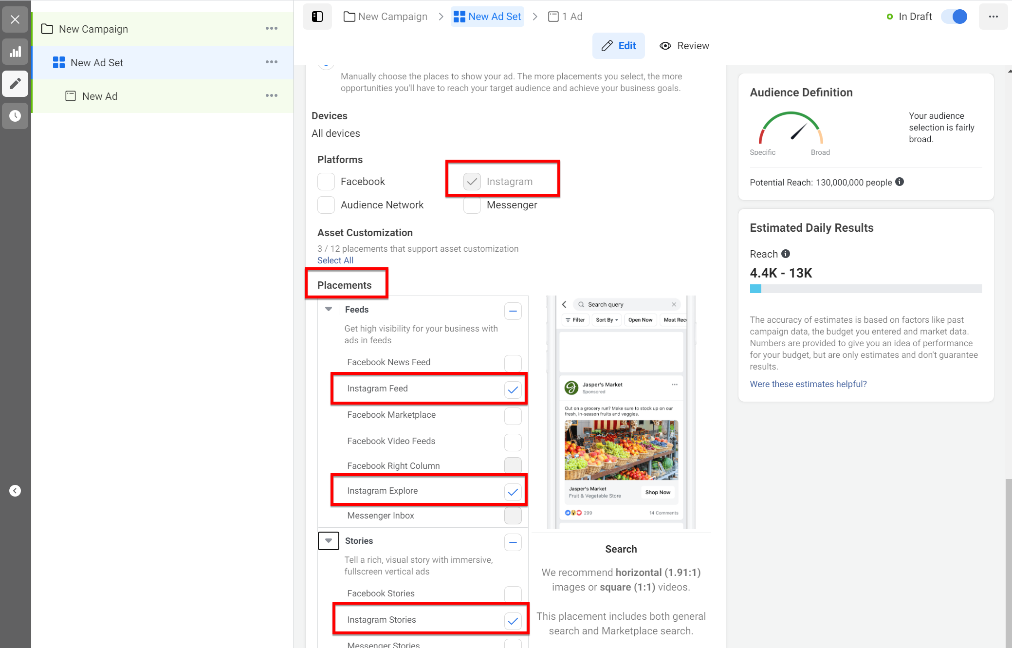 Instagram is a visual platform, meaning you need to have some sort of multimedia element to advertise your business. Most Instagram posts you see will feature either one photo or video and a call-to-action telling you to learn more or shop now. Some ads may take advantage of the Carousel feature where you can swipe through several photos or videos, or the Collection feature that uses multiple images and videos to create a sort-of look book. Where you place the ad is just as important as what type of ad you choose.