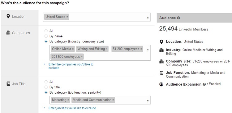 They also offer options like age, gender, school, field of study, degree, skills, and LinkedIn groups, as well as “audience expansion,” which allows you to reach members similar to your target audience.
