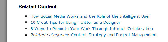 Findability can be greatly improved if related content is displayed on a post. Right now, theme developers can take advantage of the get_category/get_categories for pulling out the posts’ category and wp_get_post_tags for the post’s tags, however, what’s more difficult is displaying related posts. There are ways to try and display related posts, such as picking, say, 5 random posts from the same category/categories or posts tagged with the same words.