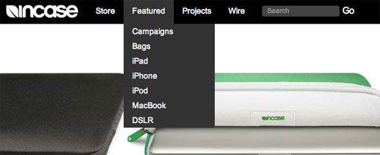 The Incase drop-down menu is slightly lighter in color shade than the navigation background, and works well with the site’s overall clean look-and-feel.