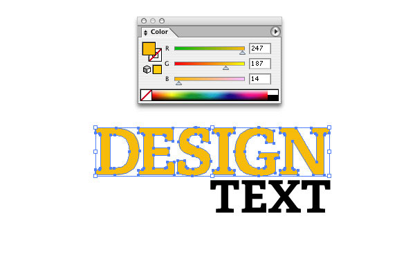 Since it will be easier to see the sides of the 3D text, we are going to add color to the letters. First select all the letters of “DESIGN” and fill it with a yellow. Note: If you don’t see the Color Panel open, you can go to Window > Color (F6).