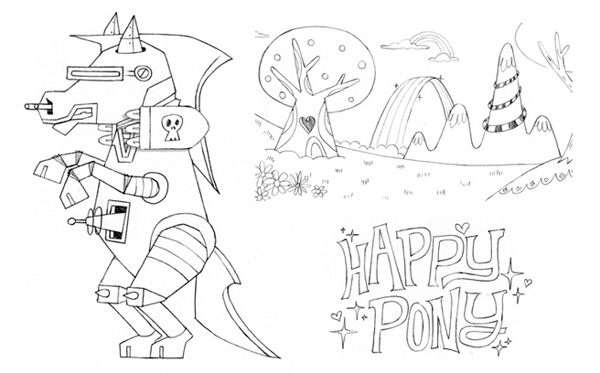 “I still enjoy eraser dust, taping an extra piece of paper to my current one because I ran out of space, breaking lead, and just the whole experience of drawing traditionally.” “When I go to color I use the typical programs of the trade: Illustrator for my vector work and Photoshop for my texturing/coloring (and sometimes a hybrid of both).” “Happy Pony”“Happy Pony” He uses Wacom’s tablet-and-monitor-screen hybrid, Cintiq, to help speed up his workflow. “Recently, I have found myself doing less work in Illustrator and finishing entire pieces in Photoshop (thanks to the Cintiq).” “My past work has been very controlled and rigid. Using the Cintiq has allowed me to loosen up quite a bit and experiment more with different textures and inking methods.