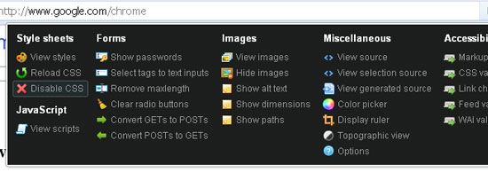 Chris Pederick’s Web Developer toolbar is a long-time favorite among web designers and front-end developers. Originally created for Firefox, it has been ported to Chrome with a slicker interface. It has loads of options for examining and understanding web page layouts, including showing block element stacking orders, displaying CSS style information about certain elements, browser cache controlling, and much more.