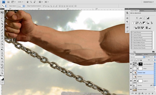 For now, we just want to focus on removing the chain links from this part of the Centaur’s arm. Continue this process, working with the Clone Stamp Tool, sampling and covering up various segments.