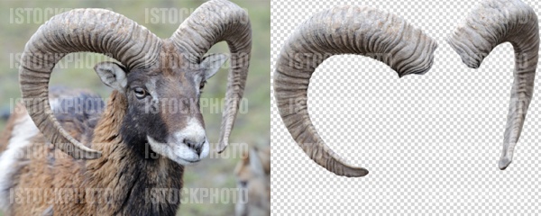 If you’d like to use the one I used, purchase, download and open up the Mouflon – Wild Sheep Goat Bighorn stock image. We are going to isolate the horns on this image. There are several ways of doing this, but I like to use the layer mask technique so I have both the left and right horns isolated (as shown below).