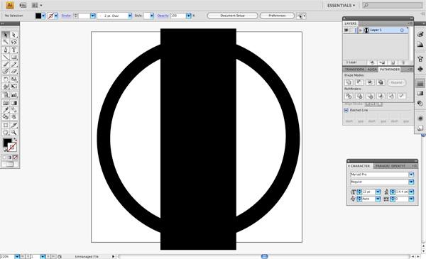 Hold the Shift key and select both the rectangle and the white circle we have just created, and once again, choose the Minus Front option from the Pathfinder Panel. Select this white shape and hold down the Shift key to also select the black circle that the white shape is contained in and select the Minus Front option one more time. This makes it so that the innermost white shape will be knocked out of the black circle rather than just being a white shape sitting on top.