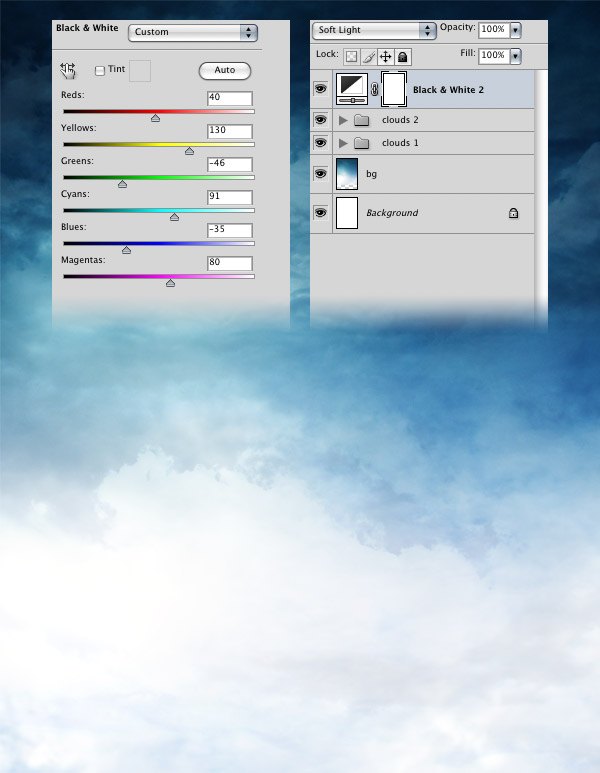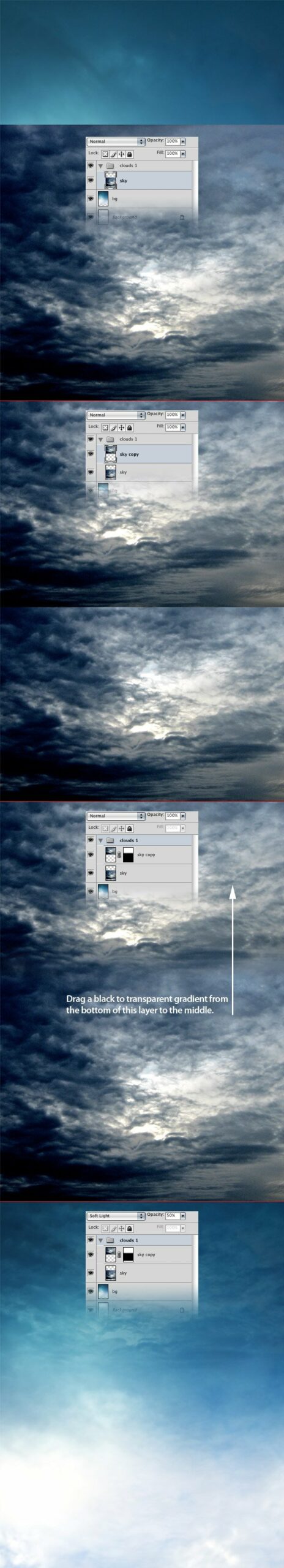 Add a mask to the duplicated layer by going to Layer > Layer Mask > Reveal All. Then select the Gradient Tool (G) and drag a black to transparent gradient from the bottom of this layer to the middle. Set the blend mode of the “clouds 1” group to Soft Light and opacity to 50%.