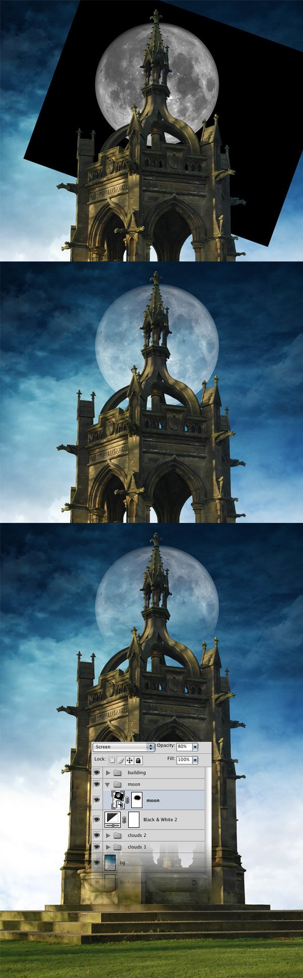 Put the “moon” group beneath the “building” group. Then set the blend mode of the “moon” layer to Screen and layer opacity at 80% to eliminate the black background. Go to Edit > Free Transform (Ctrl/Cmd + T), hold down the Shift key, then resize and rotate the moon.