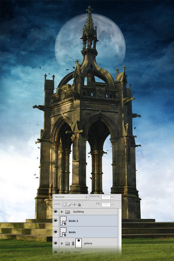Open this image in Photoshop and separate the birds from the background using the same technique which you used at step 10. Move the birds into your first document and convert this layer into a smart object. Then use Free Transform (Ctrl/Cmd + T) to change the size of this layer. Put these birds above your building.