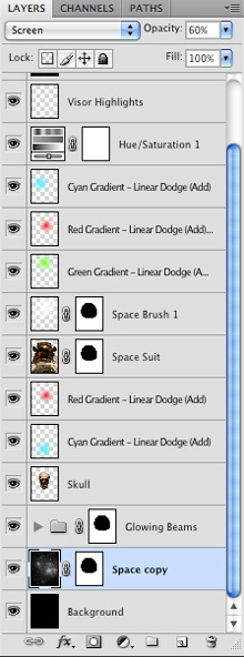 Now that we have cleaned up the visor and added our adjustment layer, we can turn the visibility of the skull layer back on. We are going to move it just below the space suit layer.