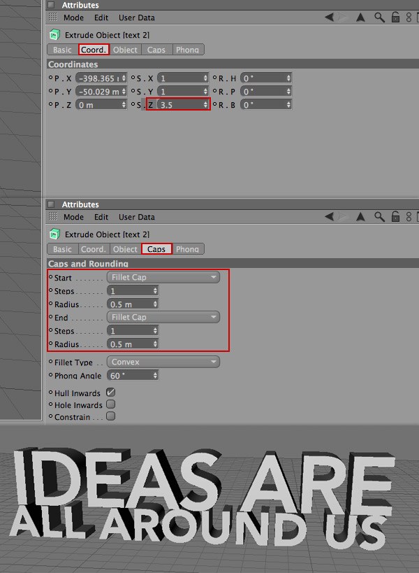 Select the first Extrude Nurbs object (“text 1”), go to the Attributes panel, and then click on the “Coord.” tab. Change the Z axis to 4. Then select the Caps tab and use the settings from the following image.