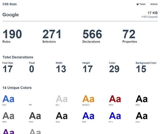 CSS Stats, just as its name suggests, provides you with a plethora of stats about a site’s CSS such how many style rules the website has, the media queries it uses, all the fonts it employs and more.