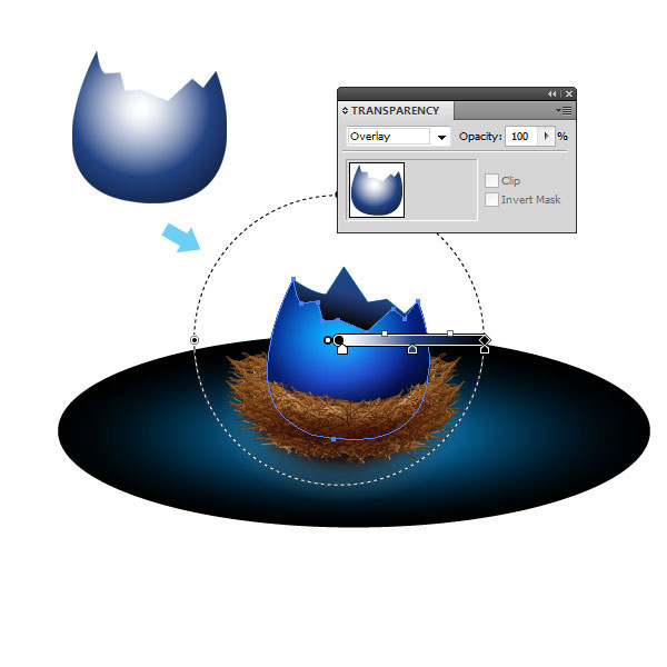To add some shine to the egg, make a copy of the front eggshell shape and add a radial gradient that’s blue and white, then use the Transparency panel to set the object’s Blending Mode to Overlay and Opacity at 100%.