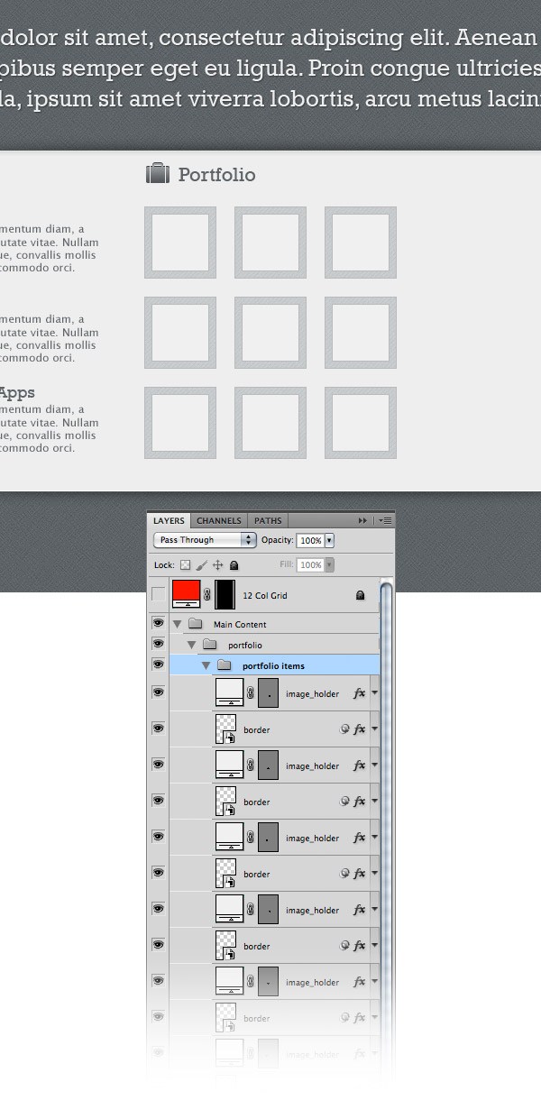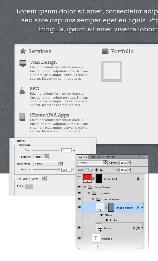 For example, I used the iMac icon for web design services, the beaker icon for SEO services and the iPad icon for iPhone/iPad apps services. For the headlines I used the font Rockwell Regular with the size 18pt and the color #5e6468. For the paragraphs of text I used the font Lucida Sans Regular with the size 12pt and the color #5e6468. Organize all these layers using groups, as you see in the image below.