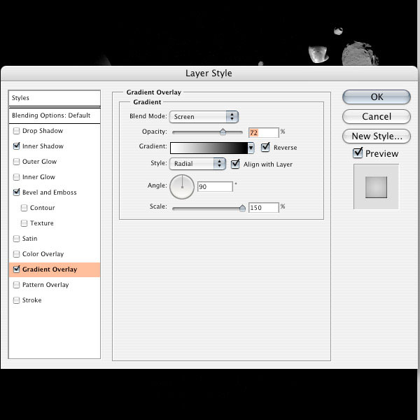 Now go to Layer > Layer Style > Gradient Overlay to give the center of the text a sort of glow since this is where the light will be coming from.