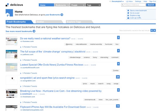 Below are some more designs with minimal eye-candy that are actually designed really well. Delicious does a great job of balancing their layout. Without getting too deep into eye-candy, they make a giant torrent of information manageable.