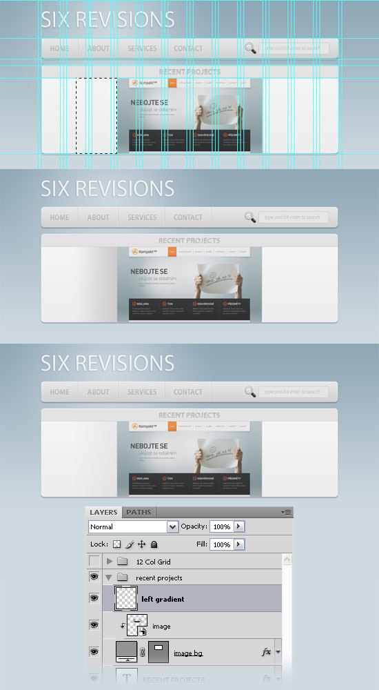 26 Create a new layer, turn your guides on (toggle your guides’ visibility on and off using Ctrl+;), select the Rectangular Marquee Tool (M) and create a selection like I did in the following image. Select the Gradient Tool (G) and drag a #CCCCCC to transparent linear gradient from the right side of your selection to the left side. Name this layer left gradient and set its opacity to 30%.