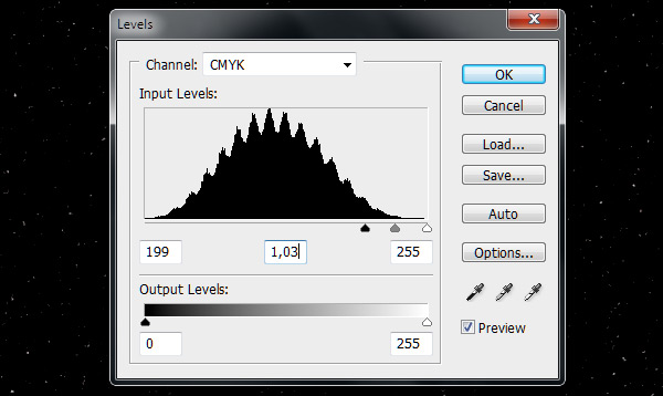 After that, click Image > Adjustments > Levels and play with the Input Levels values a bit to achieve less frequent and more spaced-out stars.