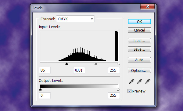 We will use an image adjustment to enhance the color of our image. Go to Image > Adjustments > Levels and play around with the Input Levels values to make your clouds more vivid.