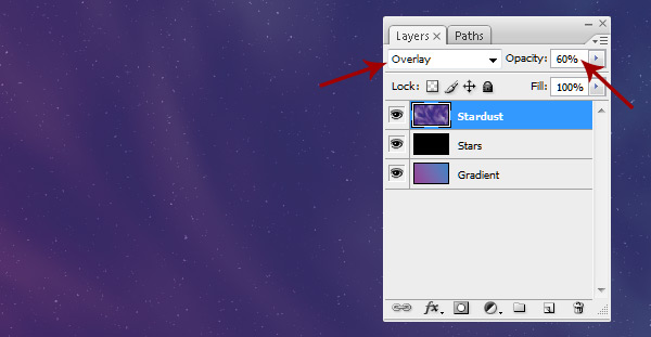 Set the Blend Mode of the “Stardust” layer to Overlay and also reduce the Opacity to 60%.