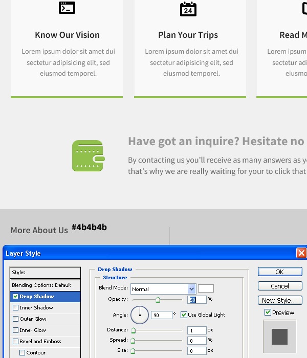 As shown below, the first section’s heading is “More About Us“. We will apply a Drop Shadow layer effect to the heading texts with Opacity set to 1%.