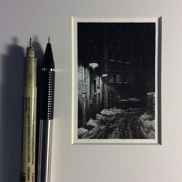 Taylor Mazer chooses to work in a somewhat smaller scale than what most artists are drawn to. His drawings are hyper detailed, atmospheric, and his “Small Drawings” series are done on no more than a few square inches of paper. Often depicting quiet and seemingly mundane scenes, Taylor’s illustrations come alive when you look more closely and experience his drawings in a more intimate fashion.
