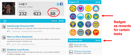 The badges that users unlock for checking in at new locations offer rewards that can be shared with friends online.
