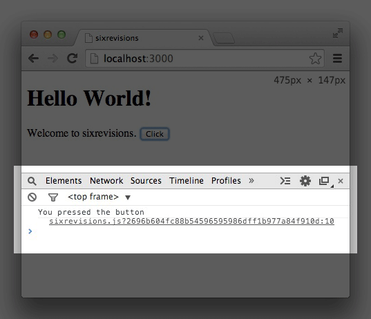 The command line runs on the server (where the application is hosted) while the JavaScript console runs on the client (in the user’s browser). With the JavaScript console open, press on the “Click” button again. You’ll see a message appear in the console with each press of the button:
