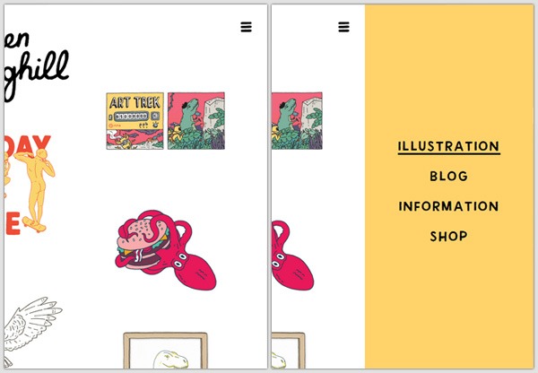 The navicon looks like a set of three stacked lines: This icon is also called the “hamburger menu icon” because, well, it kind of resembles the outline of a hamburger. You don’t necessarily need to use a navicon as the trigger of your off-canvas menu; you can also use a button labeled with a conventional term like “Menu”. This might even be a better option; the results of one A/B test by web publishing company Exis suggest Internet users still aren’t familiar with the navicon. By the way, another term for off-canvas menu is navigation drawer, but the latter is associated specifically with Android development. They both work the same way though.