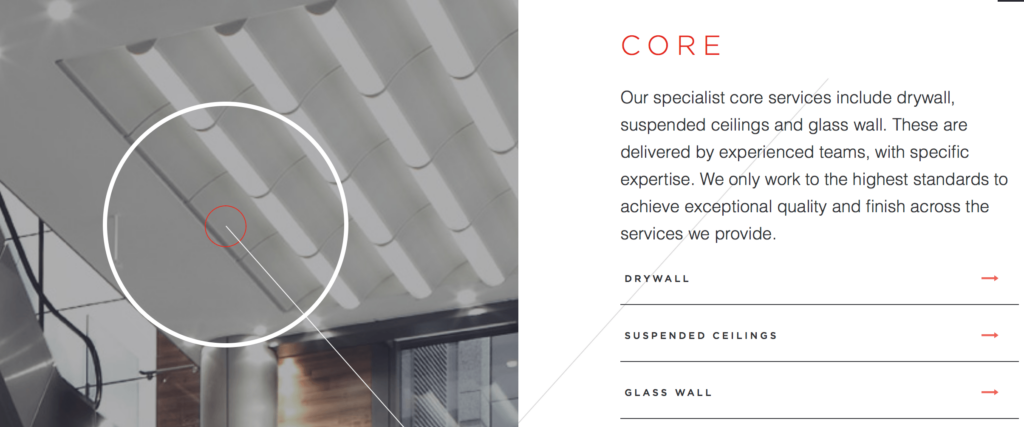 Additionally, each section focuses on a type of service and the sub-services below it. For example, the first section focuses on the core building services and lists drywall, suspended ceilings, and glass wall below. If someone is looking for core services, they can find all those services in one area.