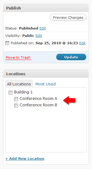 Now that we have some locations, let’s add them to an Event post! Head over the Add New Event screen (or edit an existing event), and you should see a new Locations widget on the right-hand side.