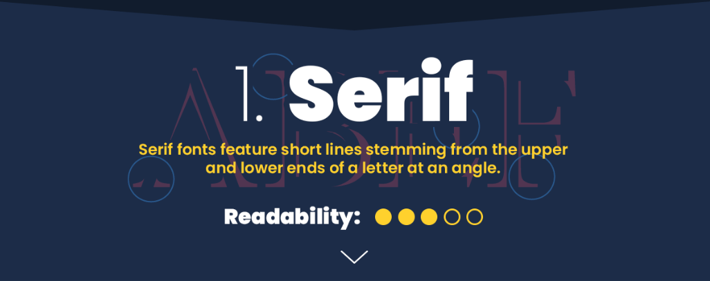 Serif fonts feature short lines stemming from the upper and lower ends of letters at an angle. Readability of Serif fonts varies, but overall, the readability is mediocre.
