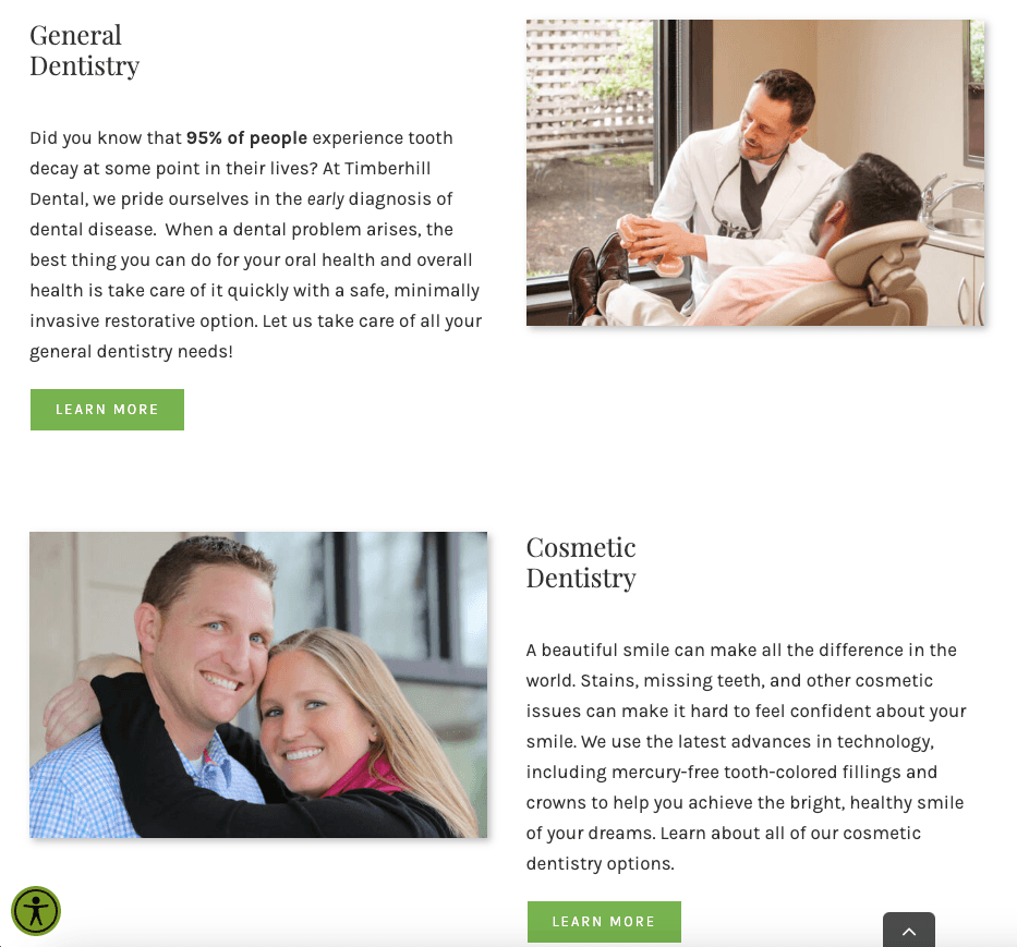 Austin Dental Works does a great job integrating icons into their website to help enhance their messaging. They use icons like a tooth and a smile to enhance the written content on their website.