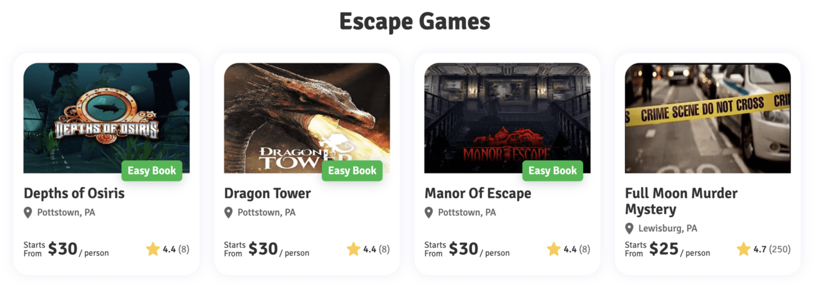 On your top navigation bar, you might have an “escape rooms” category. Users can click this tab to see an escape room list and even book their favorite room for an upcoming event. You might have another option labeled “locations” with your business address and a map.