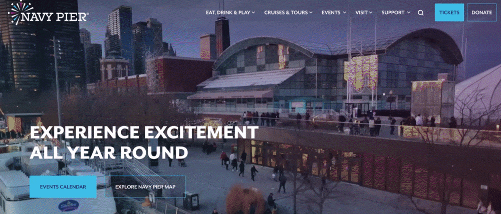 If you want to see one of the best travel web designs, check out Navy Pier. This website uses high-quality visuals and custom graphics to create an engaging presentation of their tourist attraction.