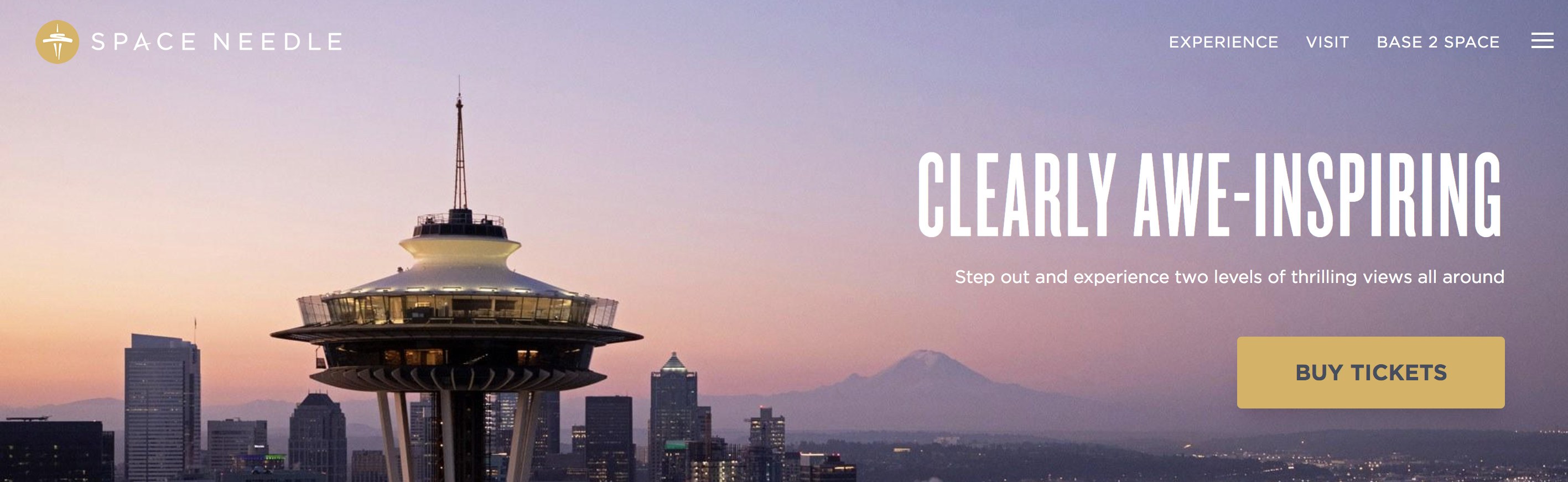 Another of the best travel website designs is the Space Needle website. The minute you enter their website, you’re greeted by a beautiful city-view photo of this tourist attraction.