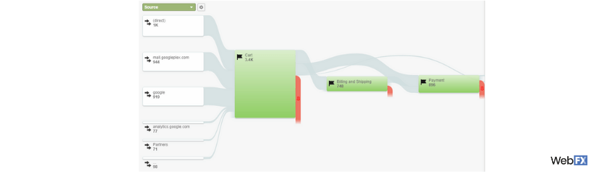 In the example below, for instance, you can see that a goal includes reaching the payment page. It’s also mapped out to demonstrate the path taken by shoppers. They visit the website, add a product to their cart, provide their billing and shipping information, and then their payment information.